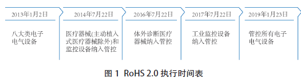 第一,適用產品范圍擴大,在原RoHS指令管控的八大類電子電氣設備基礎上擴展至包含醫療器械、監控設備在內的幾乎所有電子電氣設備(見表1),并針對不同產品類別規定了不同的執行時間(見圖1)