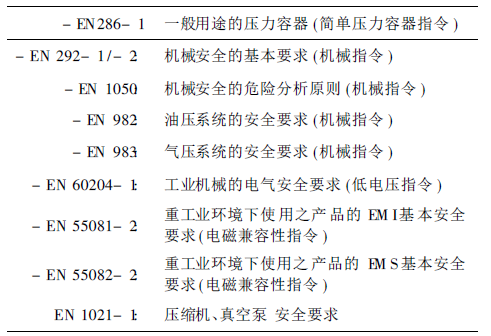 (1) 設(shè)計(jì)符合相關(guān)產(chǎn)品安全標(biāo)準(zhǔn)的壓縮機(jī)產(chǎn)品CE安全規(guī)定除18種不同指令外,另有各種不同的產(chǎn)品安全標(biāo)準(zhǔn)。壓縮機(jī)產(chǎn)品可能涉及的安全要求標(biāo)準(zhǔn)見表1。
